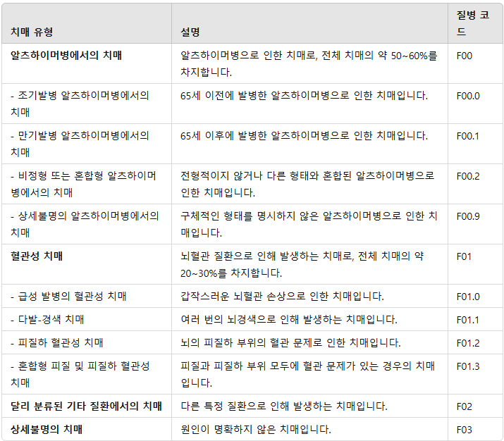 - 후천성면역결핍증(에이즈) 관련 치매(F02.4): 에이즈 환자에서 발생하는 인지 장애